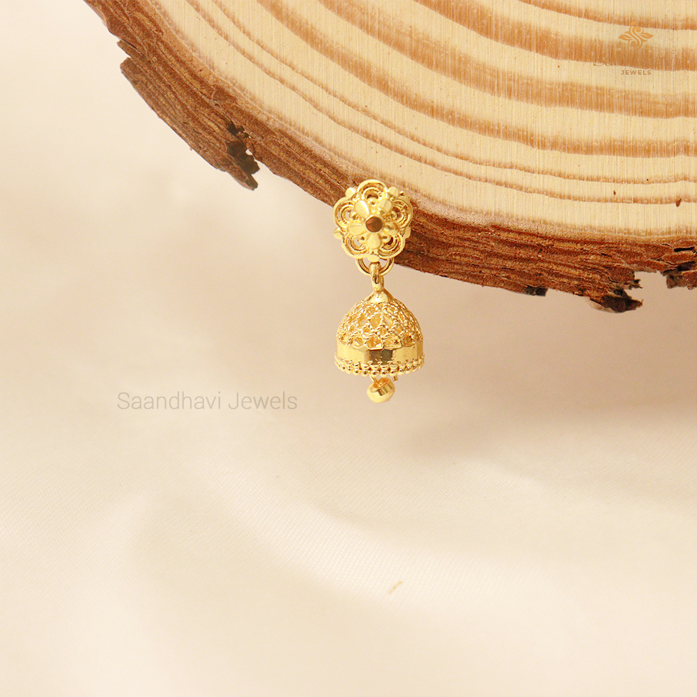 The jhumka appears to have intricate detailing and a small dangling element at the bottom, showcasing a classic and sophisticated Indian design.