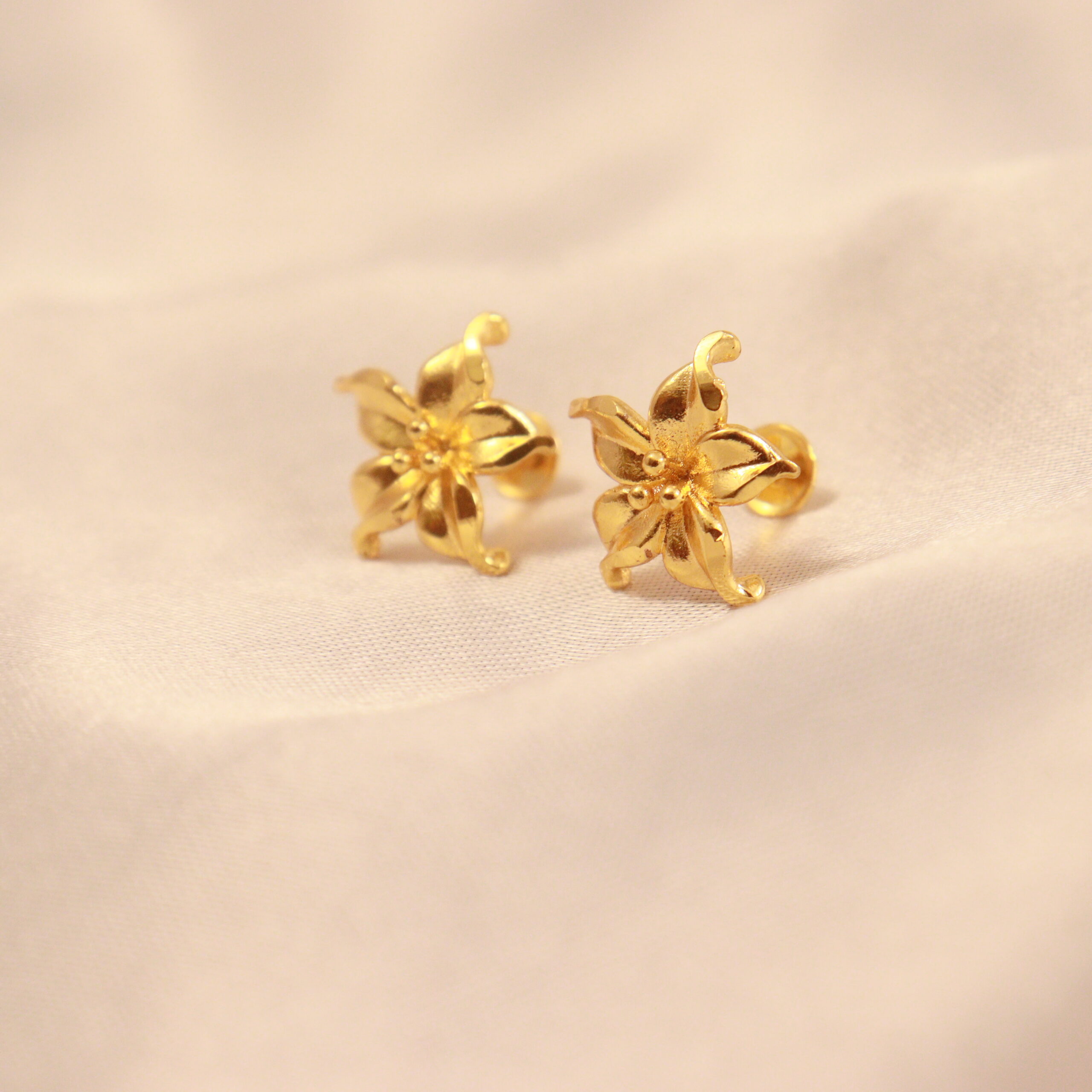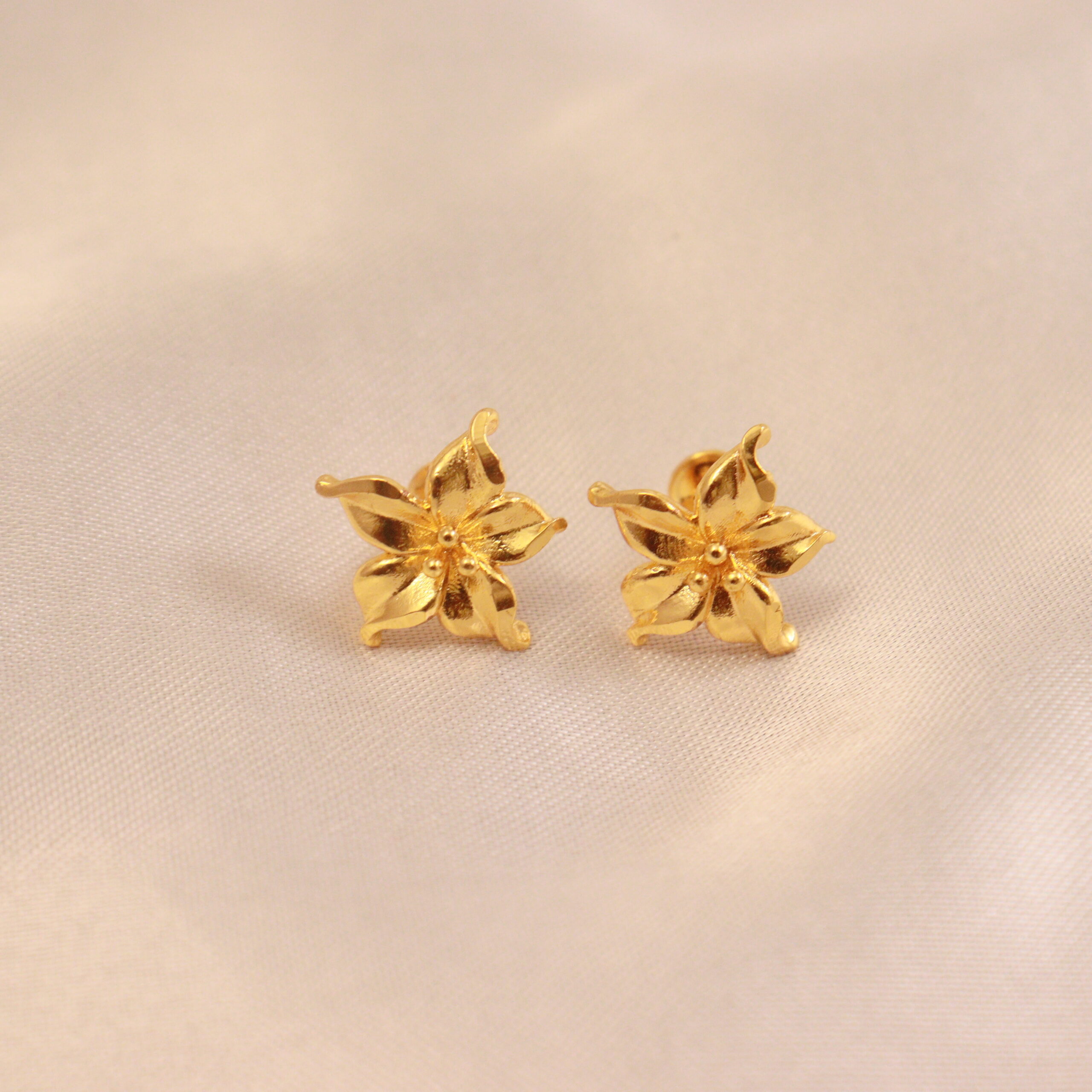 Delicate blossoms captured in gold – these exquisite earrings showcase intricate floral motifs, each petal meticulously crafted. A touch of understated elegance for everyday wear.